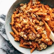 Roasted sweet potatoes topped with creamy chipotle sauce, spicy ground chicken, avocado, cilantro, and pickled onion. My family loves them!