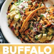 These Buffalo Chicken Tacos are the cousin to the Buffalo Cauliflower Tacos and the Hawaiian Chicken Tacos, both of which are also delicious.